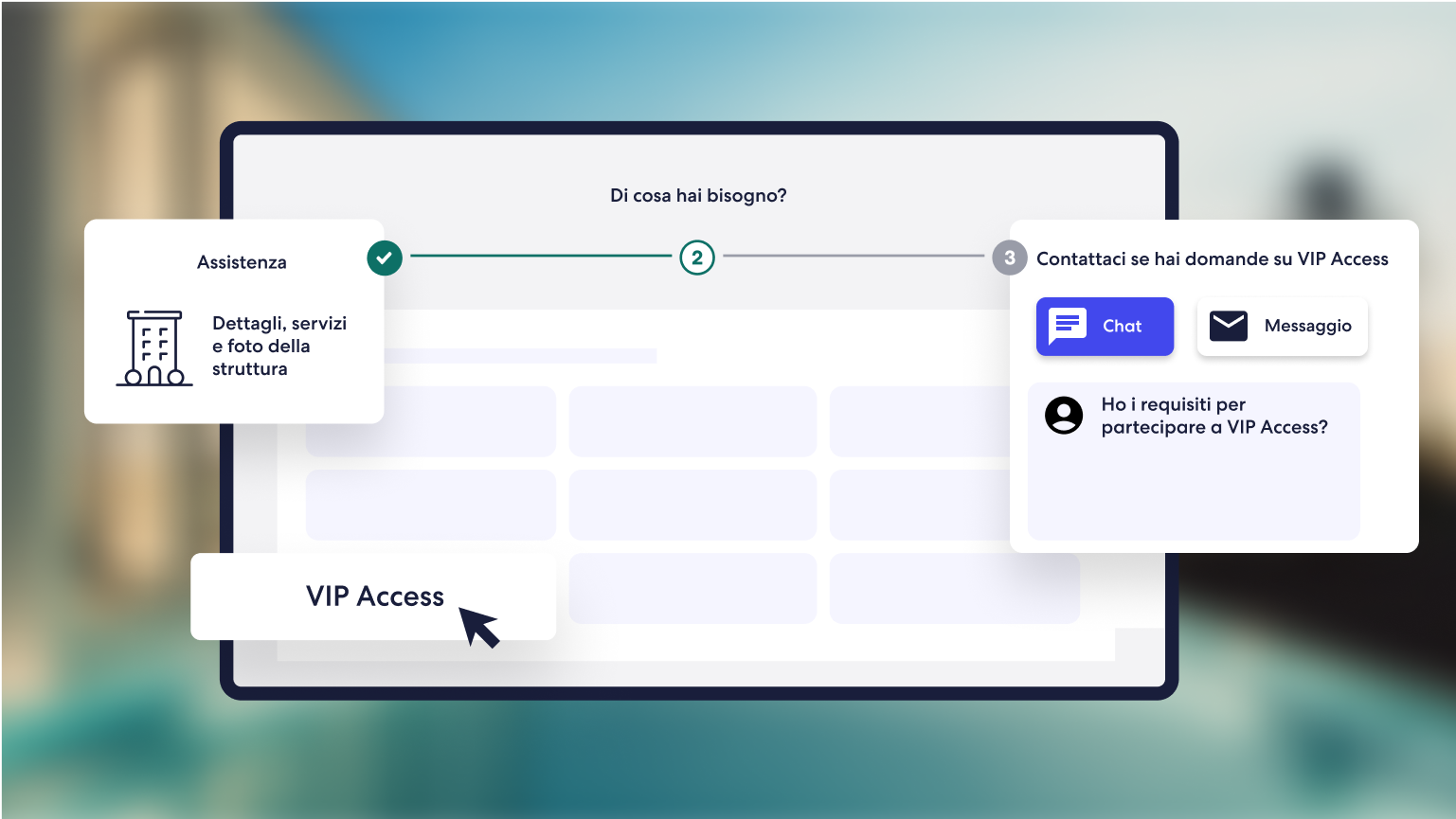 Punta i riflettori sulla tua struttura con VIP Access. Con pochi e semplici passaggi puoi scoprire se hai i requisiti richiesti per l’iscrizione. Parlane con un operatore o accedi a Partner Central, seleziona Dettagli, servizi e foto della struttura > VIP Access e inviaci un messaggio.